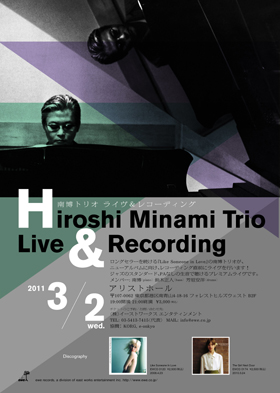 南博率いるピアノトリオがニューアルバムの録音をライヴ形式で行うことが決定した。会場は表参道に昨年10月にオープンしたアリストホール。南博、鈴木正人、芳垣安洋の不動のトリオによって演奏されるジャズのスタンダードナンバーを、PAを介さず、CDの録音に求められるきわめて純度の高いアコースティックなサウンドで聴くことができる。