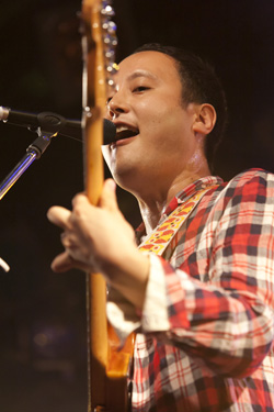 そこから、これまた夏にピッタリの名曲“Garden City Life”へとシームレスに流れ込み、さらに2000年代のカーネーションを代表するナンバー“ANGEL”をパフォーム。人気曲の連発にオーディエンスも笑顔と歓声で応える。MCを挟んでの“ジェイソン”では湿気も暑気も吹き飛ばすパワフルな快演で突っ走り、最後は彼らの名が大きく広まるきっかけとなった日本語ロックのクラシック・チューン“Edo River”で爽やかに締め。当然、会場からのアンコールは鳴り止まず、それを受けてカーネーション+Chocolat+片寄明人+栗原務の7人が登場! Chocolatと片寄の2人はコーラス、前日にベーシストの松永孝義が急逝したことを受けてか、MUTE BEATのTシャツを着用していた栗原はタンバリンを手に持ち、カーネーションのライヴではお馴染みの“夜の煙突”セッション大会に突入する。栗原が大田の頭でタンバリンを叩いておどけてみせたり、Chocolatが住友林業のCMキャラクター〈きこりん〉の声を披露したりと、どんちゃん騒ぎのような賑々しさのなか、客席も右に左に大揺れしてボルテージは最高潮に達し、華やかな盛り上がりのうちに公演は終了した。
