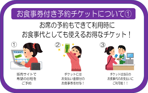 ・予約チケットはお食事券付となっておりますが、ご飲食代がお食事券の金額よりも少額であった際、差額の返金ならびにお釣りはお戻しできません。