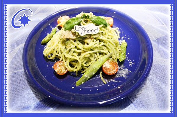 (パスタ/ジェノバソース/にんにく/ベーコン/アスパラ/ミニトマト/グラナパダーノチーズ/バジル/モナカ)