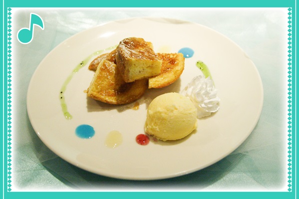 (フレンチトースト/バニラアイス/ホイップクリーム/メイプルシロップ/キウイソース/ブルーベリーソース/マンゴ―ソース/練乳/青色色粉/粉糖)