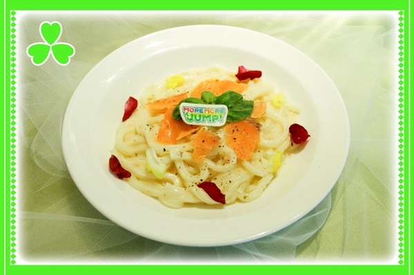 みのりの好きなサーモンと雫の好きなうどんを合わせてクリームパスタ風に。