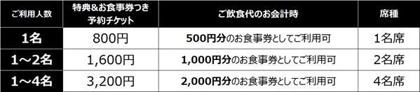 座席数の削減および間隔確保にともない、チケットぴあの予約専用ページにて「特典&お食事券付き予約チケット」を先着販売いたします。