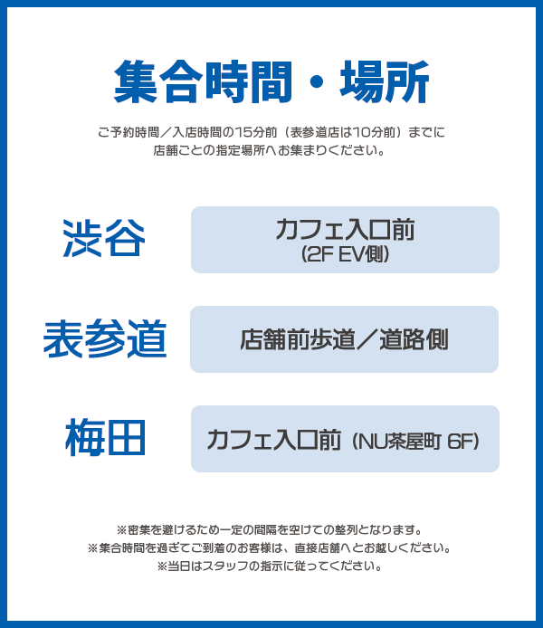 ご入店時間の15分前(表参道店は10分前)までに当日券に記載の集合場所へお集まりください。