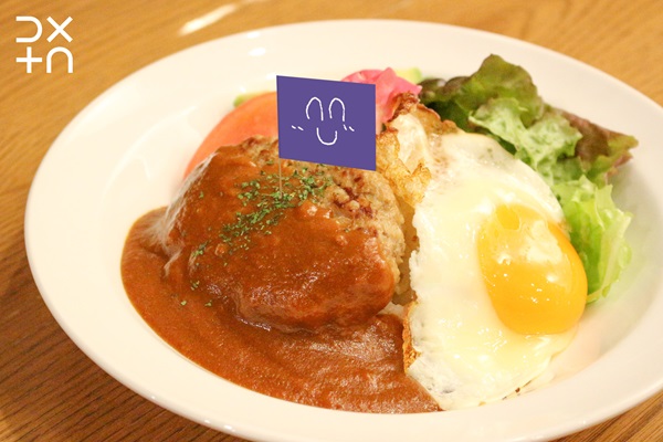 (白米・チーズインハンバーグ・デミグラスソース・サニーレタス・トマト・アボカド・エディブルフラワー・パセリ・目玉焼き・オリーブオイル・食塩)