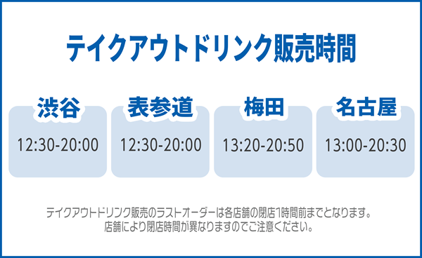 ※テイクアウトドリンクのラストオーダーは各店舗の閉店1時間前となります。店舗により閉店時間が異なりますのでご注意ください。