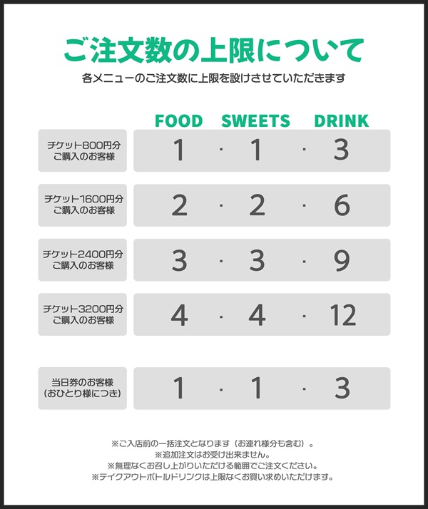 ・空席のご用意がなく店内飲食がご利用いただけない場合でも、テイクアウトメニューのご購入およびグッズ購入がご利用可能です(その際にも店頭スタッフへチケットのご提示をお願いいたします)。