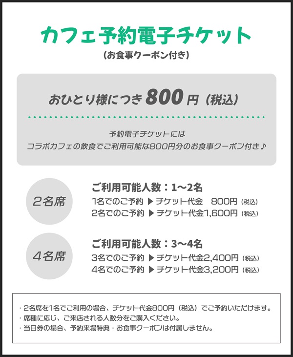 ※予約チケットは先着販売につき、座席が満了となり次第販売終了となりますので、コラボカフェご利用を希望される方は事前に予約チケットをご購入いただくことをおすすめしております。