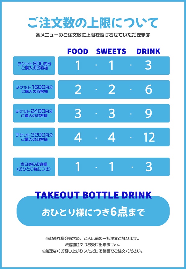 ※ご予約時間(入店時間)から30分過ぎてもご来店がない場合はキャンセル扱いとなり、ご入店いただけません。お食事クーポンの利用、グッズのご購入もお受けできかねますのであらかじめご了承ください。また、当日席へのご案内可能時間に関しましても各回の入店時間から30分後までとなります。