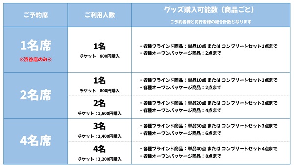 これまでご予約日に来店がかなわなかったお客様対応として予約チケットを用いた後日利用のご案内を行なって参りましたが、諸般の事情により順次、後日利用の適用ならびにご案内を終了させていただくこととなりました。ご予約いただきました回の開始時間から30分を過ぎてもご来店がない場合、ご購入のチケットはキャンセル扱いとなり無効とさせていただきます。各種特典のお渡しやお食事クーポンの利用、グッズ購入もお受けできかねますのであらかじめご了承ください。