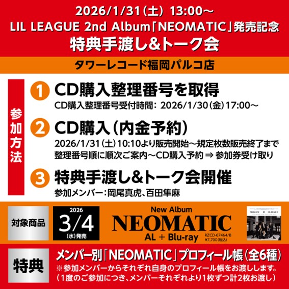 【LIL LEAGUE】2026/1/31(土) 2ndアルバム「NEOMATIC」発売記念 特典手渡し&トーク会 福岡会場開催決定!