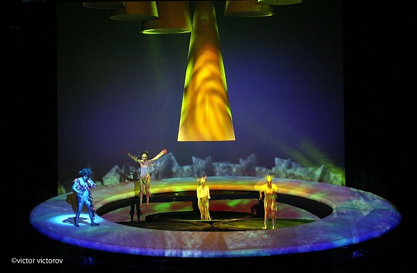 《ラインの黄金》は往年のSF映画を彷彿させるようなオープニング映像に始まり、ニコライ・パナヨトフがデザインした舞台装置では、ライン川を象徴する巨大な円盤と、舞台につるされたいくつものコーン(三角錐)に、投影されるプロジェクション・マッピングにより情景の変化が描かれます。登場人物の多くはアニメ映画のキャラクターのようなキッチュな装束をまといコミカルな姿で登場します。