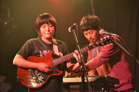 そんななかトップバッターとして登場したのは、紅一点・岩崎由季(ヴォーカル/ギター)のキュートかつファニーな歌声で、USインディー勢にも通じる独自のポップ・ロックを日本語で展開する5人組、OTOTOI GROUP。ちょっぴり寂しげなピアニカの音色とほのぼのとしたコーラスが耳に残る“Hire”でスタートし、弾けるような“Hole”に続きます。カウントと共に「OTOTOI見参!」の合図で勢いよく飛び出した“Forever pop music forever”、メンバーいわく「1番キャッチーな曲」という“WE ARE”、そしてファズ・ギターがキャッチーなメロディーをなぞる新曲“AVALON”などを立て続けに演奏。ラストとなったコンパクトなポップ・チューン“100 record”まで、楽しそうにプレイするメンバーの姿が印象的でした!