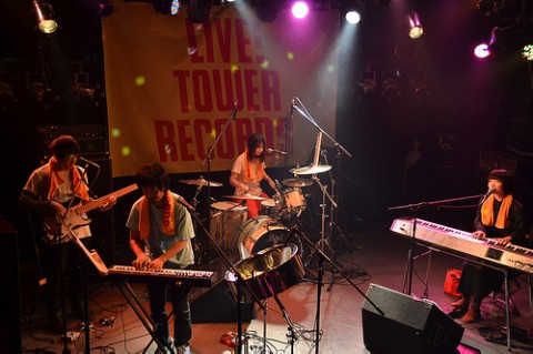 そしてこの日のトリを務めたのは、スティールパンやトランペットを採り入れたトロピカリズモにも通ずるユルめのサウンドで注目を集める4人組、ザ・なつやすみバンド。深いリヴァーヴがかかった中川理沙(ヴォーカル/ピアノ)の歌声とメンバーの輪唱、ふわふわしたシンセの音色がどこか別の世界へ誘うような“ポリネシアン観光センター”、MC.sirafuが吹くトランペットのメロディーがノスタルジックな“せかいの車窓から”で、早くも会場を彼らの色に染め上げます。続いて、タワー渋谷店のリニューアル・オープンに合わせて11月23日に同店で先行販売するニュー・シングル“めくらまし!”より表題曲と“デートソング”を披露。スティールパンが軽快に転がる“自転車”、マーチング風リズムからの2ビートで駆け抜ける“パラード”を挟んで、本編は“悲しみは僕をこえて”で一旦終了します。アンコールには、「どうしよう!? 用意してなかった(笑)」と本気で戸惑いながらも、“天の川”でイヴェントをばっちり締めてくれました!