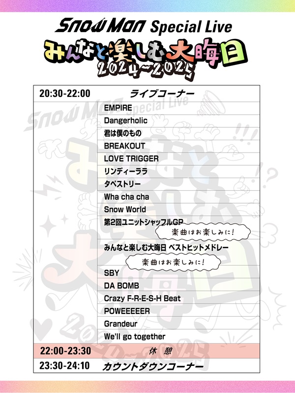 Snow Manが今年2024年の大晦日12月31日に行うYouTube生配信「Snow Man Special Live~みんなと楽しむ大晦日!2024 – 2025~」のセットリストが公開された。