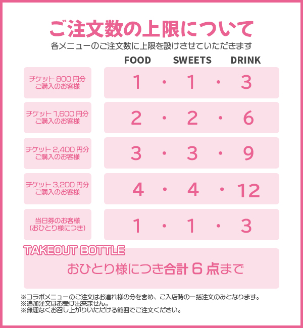 ※グッズの購入上限数はカフェのご予約席数ではなく、実際にご来店いただいたご利用人数が基準となります。1名で2名席(1,600円分)のチケットをご予約・ご利用いただいた場合でも、お買い求めいただけるのはおひとり様分の上限数までとなりますので、あらかじめご了承ください。