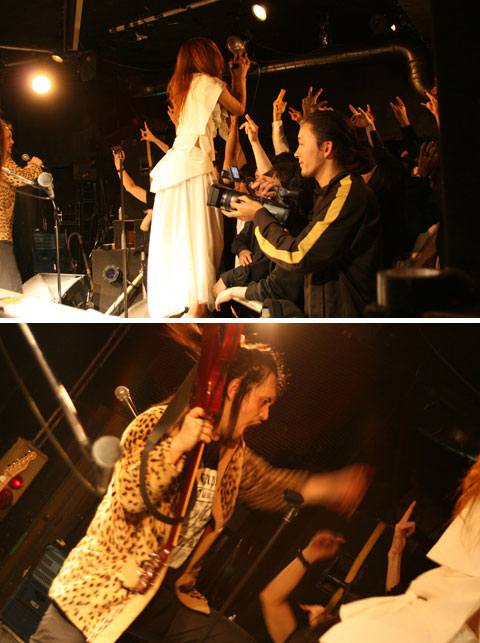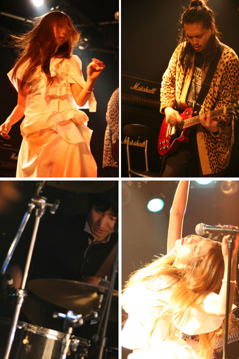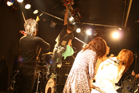 殺伐とした幻想が渦巻く世界観を体現するプレイヤー陣のエモーショナルなパフォーマンスと、その中心でトランシーに歌い続けるハチスノイトの存在感。生身の彼らが放出するエネルギーは混沌のなかで果てしなく膨れ上がり、ラスト手前の“火焔鳥”でとうとう爆発。依田やハチスに比べてやや控えめに見えたベースの眼鏡男子、ハヤシまでもが暴れながら天井によじのぼり始め、そのままラストの“楽園”へと雪崩れ込む。観客たち(ほとんど男子)もステージ前に殺到して怒号を上げ、会場内が異様な興奮状態に上り詰めたところで本編が終了した。