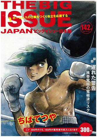 ※THE BIG ISSUEはご存知の方も多いと思いますが、ホームレスの方々支援している雑誌で、300円の代金の内160円が販売した方に戻るという仕組みで、単に援助するのではなく自立の為に労働と報酬を得る機会を提供しています。最新号の表紙は"あしたのジョー"です。駅などで販売員の方を見かけたら、是非一度読んでみてください。