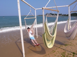 開場前にハンモックに揺られる福岡店のスタッフ。