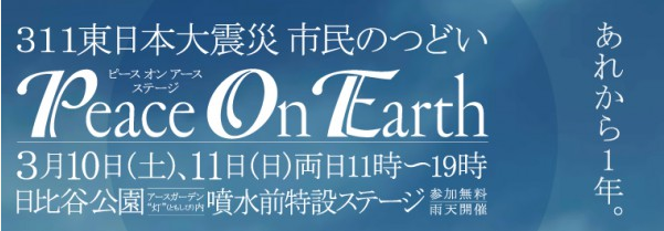 311東日本大震災から丸1年となる2012年3月10日(土)、11日(日)の2日間、東京都・日比谷公園に、心ある市民がつどい、被害に遭われた方々を追悼し、これからの未来を共有する場として『311 東日本大震災 市民のつどい Peace On Earth』が開催されます。